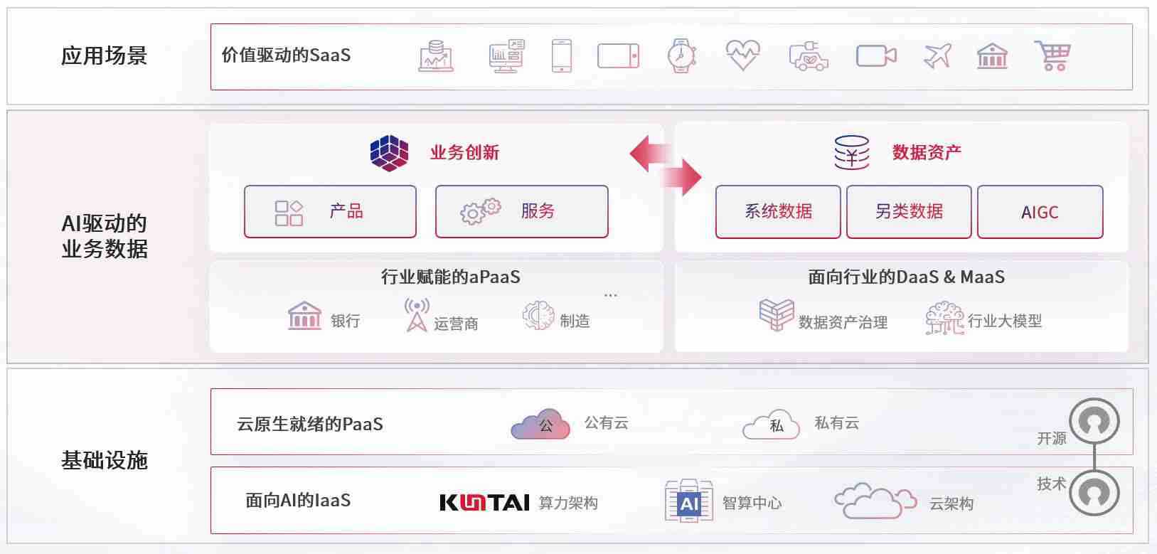数字时代,,,围绕企业数字化转型的关键要素,,,,尊龙z6数码开创性的提出数云融合战略和技术体系框架,,,着力在云原生、、、数字原生、、、AI原生和信创产业上架构产品和服务能力,,为处在不同数字化转型阶段的快消零售、、汽车、、、金融、、医疗、、、、政企、、、、教育、、、、运营商等行业客户提供泛在的敏捷IT能力和融合的数据驱动能力,,构建跨界融合创新的数字业务场景和新业务模式,,,助力企业级客户建立面向未来的核心能力和竞争优势,,全面推动社会的数字化、、智能化转型升级。。